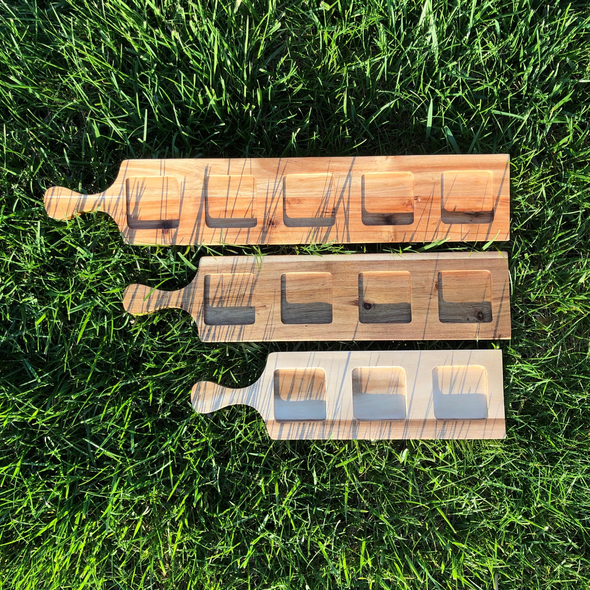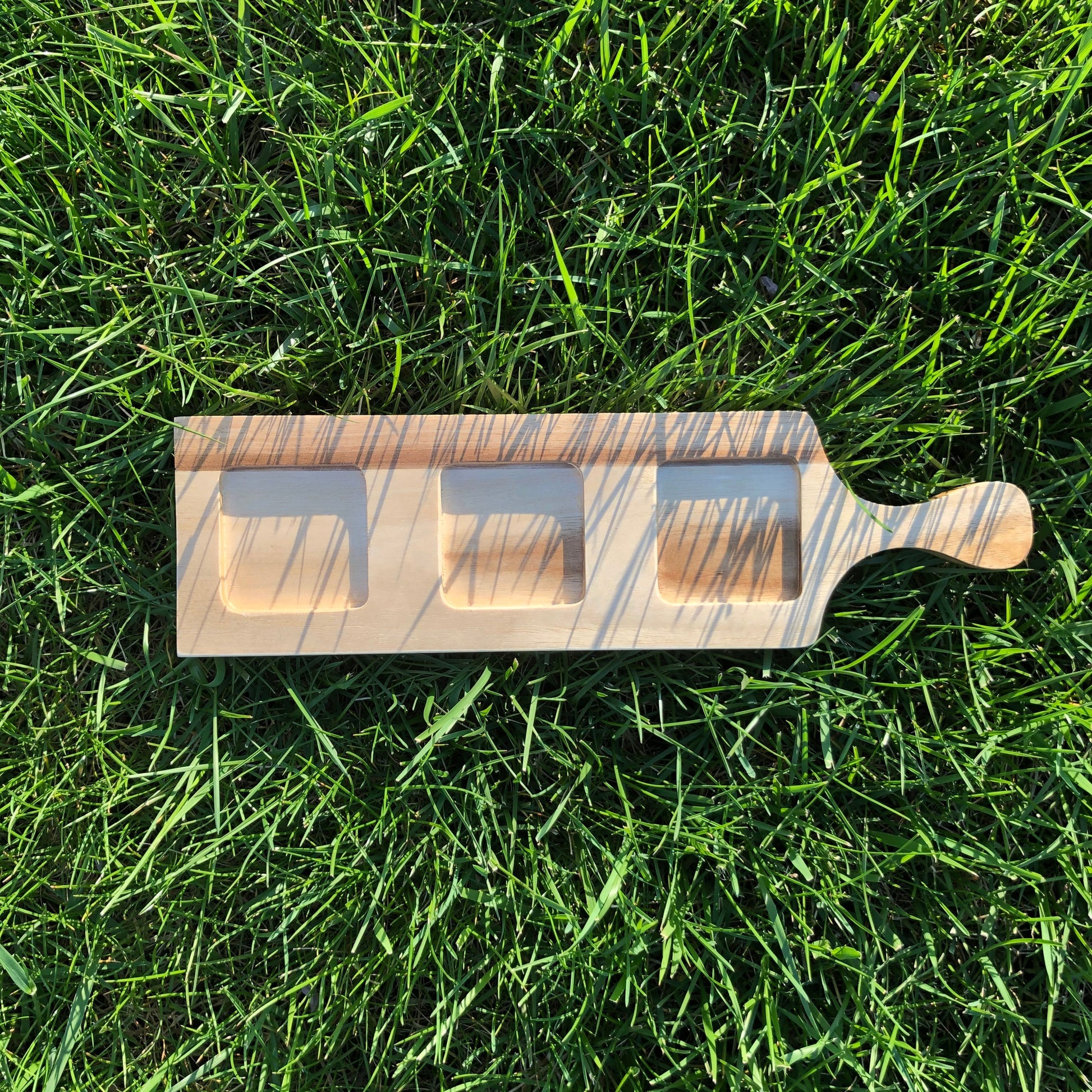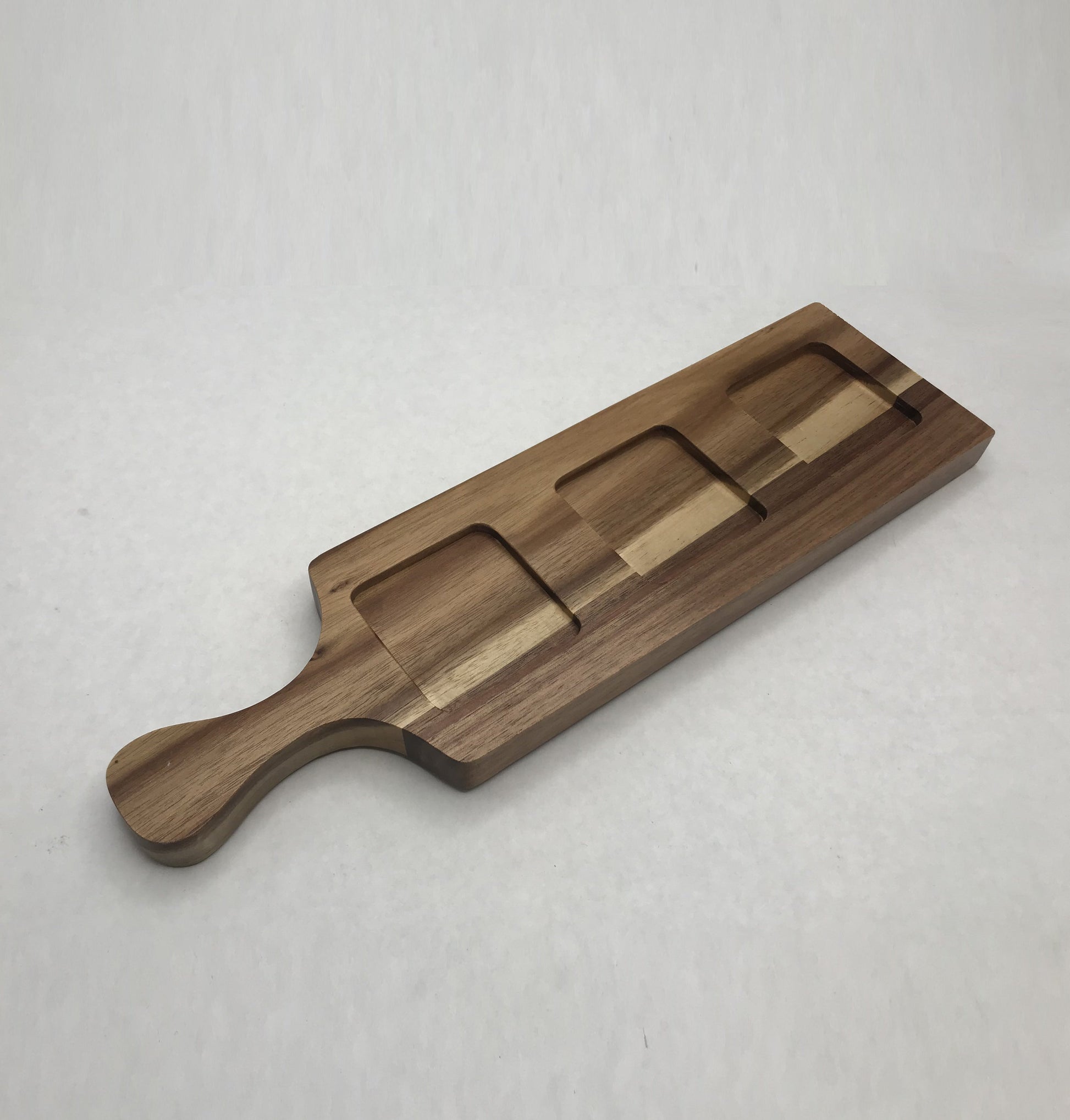 Meet our Acacia 3-hole flight board. Like all our products, it?s non-toxic, eco-friendly and even double-sided for easy use. Capable of holding shots and sampler glasses or offering multiple beer samples; this board is perfect for serving and tasting. With round step-down cut-outs on one side and square shaped on the other, the three aligned cut-outs hold one glass each, while a smooth tapered handle ensures the ease of transport from cellar to tasting room. 100% made from plantation grown Acacia wood. Easy to care for and dishwasher safe.